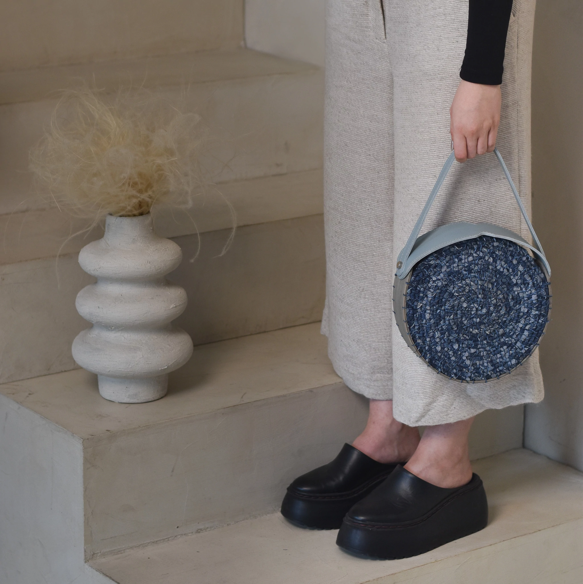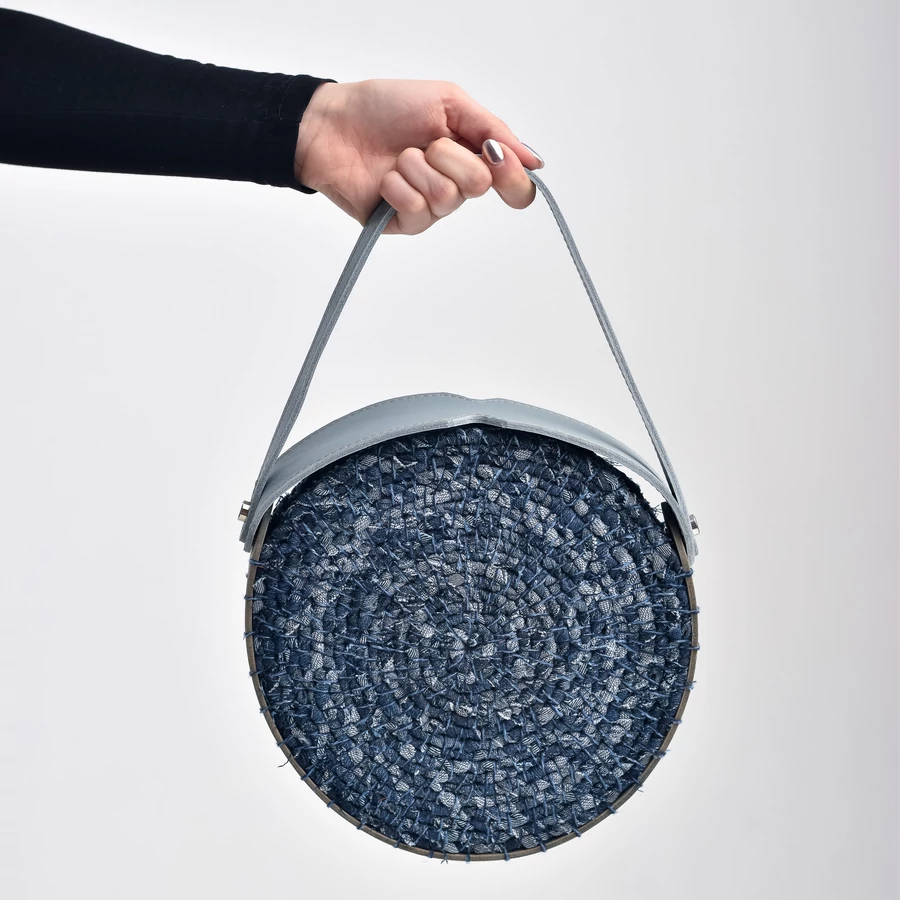 A unique shoulder bag made from upcycled denim, combining natural and industrial materials. Each piece is crafted by employees with special needs of the MAACRAFT social workshop.